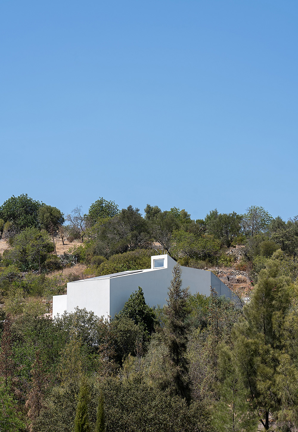 Description: The project strategy consists to define the house in a compact volume, which turns the back to the built environment and opens in two moments only: to north into a inner courtyard and to south to the pool terrace and to the valley. The plasticity and volume is the result of three fundamental aspects: the surroundings buildings; the size, slope and orientation of the plot; and finally the program proposed by the client. One of the important aspects of the project was to guarantee the three floors were never perceptible from the outside, looking for a better fit in the plot and consequently in the surrounding landscape. On the ground floor the living room and kitchen assume the center of the house, in relation with the outside space and with the double height of the mezzanine. The west-facing rooms are accessed by a double-height corridor that reveals the mezzanine and bedroom windows and the rooftop skylight. The articulation between the three floors is guaranteed by a spiral staircase assumed as the core element in every daily use of the house. To the north side, the distended sheet metal facade creates a filter in the house's relationship with the access road and allows to create a views space protected to define a patio north of the living room. To the south the big openings show up in search of the necessary intimacy and the field depth relationship that the valley allows. On the pool terrace a covered space is defined by the building which provides shade and the necessary surface to support the pool activities. The perforated metal shutters painted in dark green ensures the house plinth and the color dialogue with the greens of the surrounding landscape